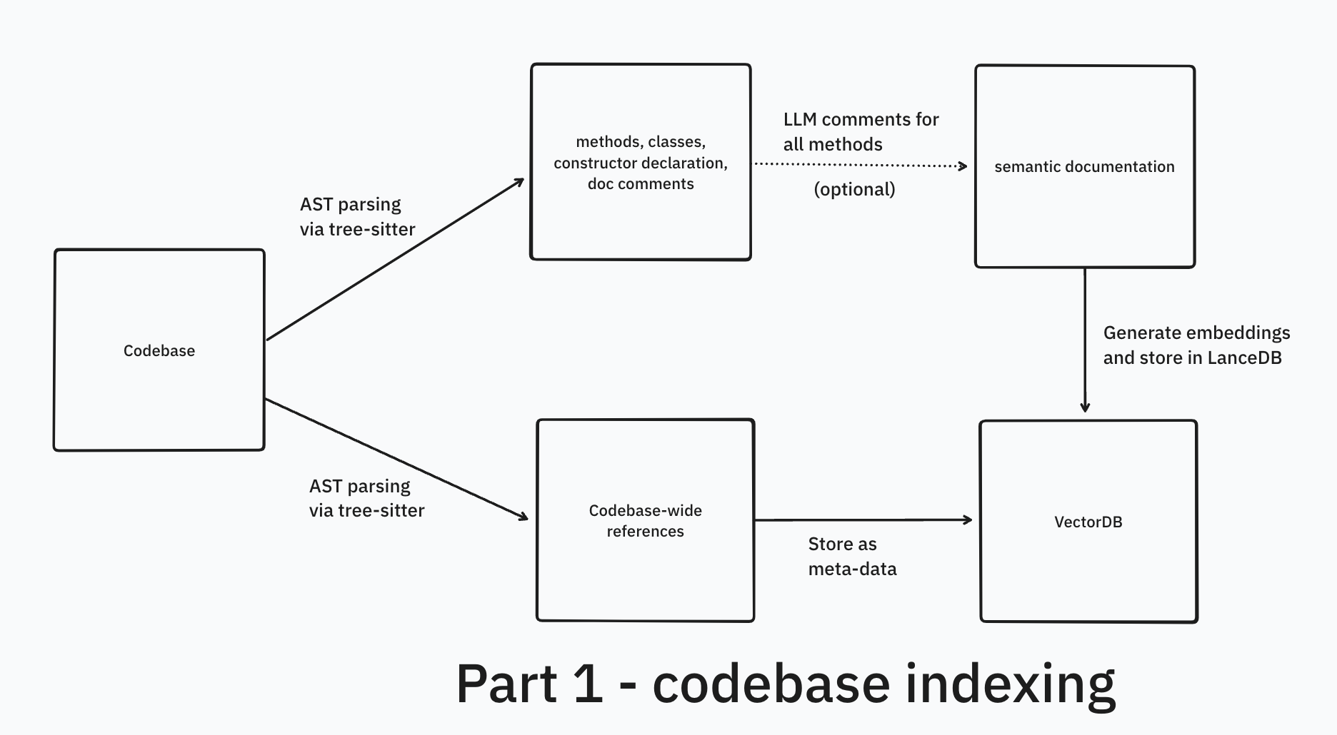 Like you may be used to doing in Cursor, CodeQA can help answer queries that span across your entire codebase, with relevant snippets, file names and references. It supports Java, Python, Rust and Javascript, and can be extended to other languages easily. There are two crucial parts to this – codebase indexing (Part 1) and the retrieval pipeline, discussed in the next post in this series ( Part 2 ). This post is all about codebase indexing with the help of tree-sitter and then generating embeddings.