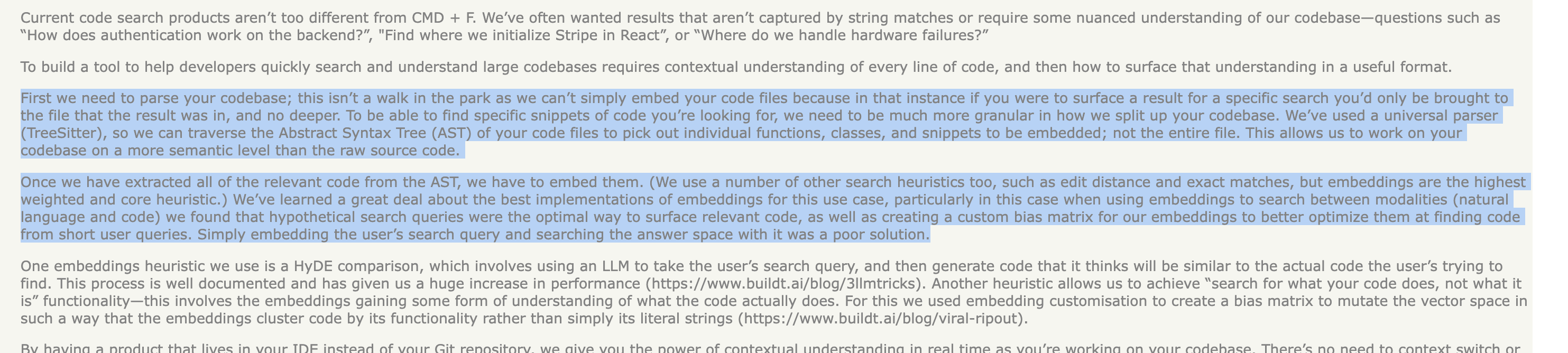 In this post, we discussed how to go from a naive semantic code search solution to a more elaborate,syntax-level chunking strategy with tree-sitter. We’re almost done with preprocessing! In Part 2 , we’ll see how to embed, some tricks to improve embedding search and then some post-processing techniques.