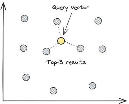 The simplest way to perform vector search is to perform a brute force search, without an index, where the distance between the query vector and all the vectors in the database are computed, with the top-k closest vectors returned.