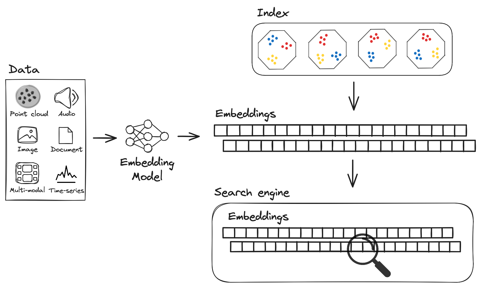 Raw data (e.g. text, images, audio, etc.) is converted into embeddings via an embedding model, which are then stored in a vector database like LanceDB. To perform similarity search at scale, an index is created on the stored embeddings, which can then used to perform fast lookups.